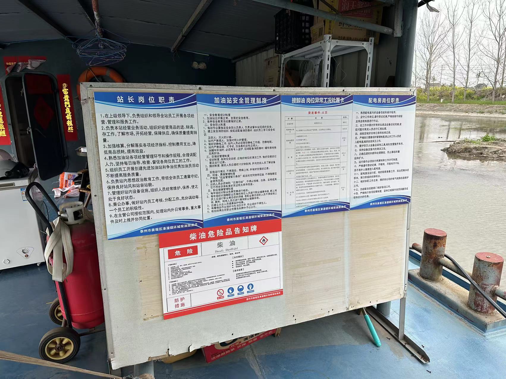 项目基本 情况 | 泰州市姜堰区溱潼镇环城柴油加油点成立于2011年07月19日,是一家储存经营危险化学品的企业,企业注册地址位于泰州市姜堰区溱潼镇北环路18号(泰东河南侧),企业类型为个人独资企业,加油点现有从业人员3人,其中主要负责人是潘传书,安全员是顾网寅,均经泰州市应急管理局考核合格,取得考核合格证。 泰州市姜堰区溱潼镇环城柴油加油点已于2021年6月10日取得由泰州市商务局出具的《成品油零售经营批准证书》(油零售证书第点2021120223号),该加油点加油船主要设操作室一处、罩棚两处、加油机两台,柴油最大储存量为40t。根据《省应急管理厅转发应急管理部办公厅关于认真做好柴油安全生产许可有关工作的通知》(苏应急函〔2022〕182号)的规定,企业依法设立,涉及柴油(闭杯闪点>60℃)生产、存储设施经依法批准,但未取得危险化学品安全生产许可证或危险化学品经营许可证的,应对全厂进行安全现状评价,在役装置未经正规设计的,应先进行安全设计诊断,并对提出的问题进行整改,符合安全条件和相关规定后,应于2023年6月30日前依法申请办理许可证。 泰州市姜堰区溱潼镇环城柴油加油点委托首辅工程设计有限公司对泰州市姜堰区溱潼镇环城柴油加油点进行安全设施设计诊断,并于2023年03月19日由企业组织专家审查通过。首辅工程设计有限公司拥有化工石化医药行业专业乙级资质,证书编号:A251024117,有效期:至2023年06月30日,设计资质符合要求。 泰州市姜堰区溱潼镇环城柴油加油点现申请领取《危险化学品经营许可证》,具体申请经营的危险化学品为:柴油,经营方式:加油点经营。 该加油点加油船船名:三航油趸6号,船舶识别号:CN20157864320,船籍港:泰州,船舶所有人:泰州市姜堰三航运输有限公司。 该站加油船为水上固定式加油船,总长:29.88m,船长:29.88m,满载水线长29.88m,船宽6m,最大船宽6.12m;总吨位94吨,净吨位78吨,参考载货量为150吨;该船共有3个货舱,3个储油舱容积共150m3。设有2处罩棚,配置加油机2台,加油机为自吸式。 泰州市姜堰区溱潼镇环城柴油加油点现位于姜堰区溱潼镇泰东河北岸、读书址村南。北侧为河堤、村道、0.4kV架空电力线,村道北侧为民居;南侧为泰东河,西侧为生活船、东侧为闲置船。 | |||